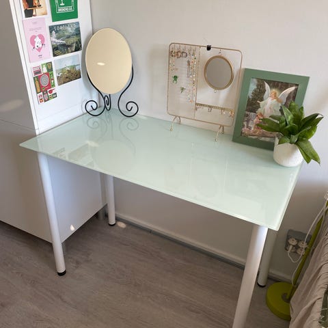 Ikean työpöytä lasikannella ja säädettävillä pukkijaloilla