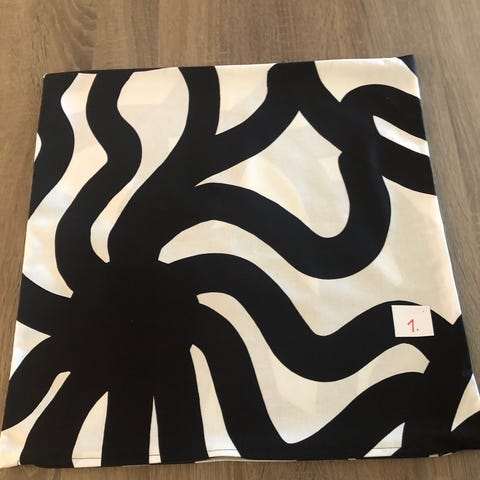 Myydään hyväkuntoiset ja puhtaat Marimekon musta-valkoiset Joonas -kuosin markiisikankaiset tyynynpäälliset. Mustassa värissä aavistus haalistumaa, jonka huomaa kirkkaassa valaistuksessa, kankaat ja vetoketjut ehjät ja puhtaat. Yhteishinta 20 euroa noudettuna / toimitettuna lähialueelle, lähetyskulut lisätään tai toridiili. Toimitus Helsinkiin triplaan mahdollista 9.-10.1. tai 9.-11.2.