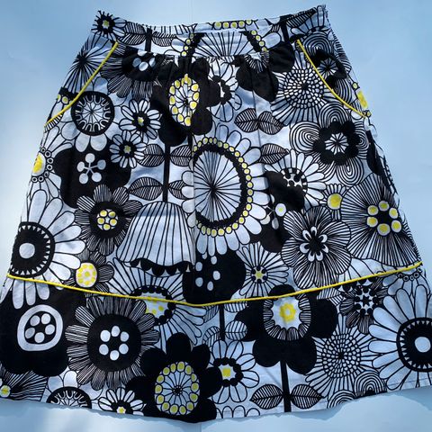 Marimekon keltainen Nelly-hame, koko 36. Kunto hyvä, saumassa hieman nukkaa. Näkyy viimeisessä kuvassa.