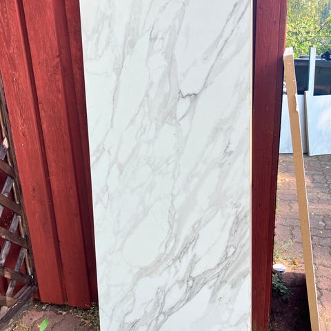 Laminaattitaso, kiiltävä valkoinen. Pituus 64 cm, syvyys 70 cm ja paksuus 30 cm.