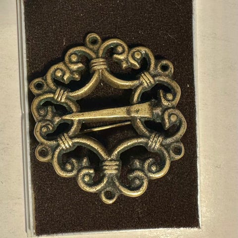 Pronssinen Suotniemen solki, mukaan tulee alkuperäinen kirkaskantinen samettityynyinen rasia.
