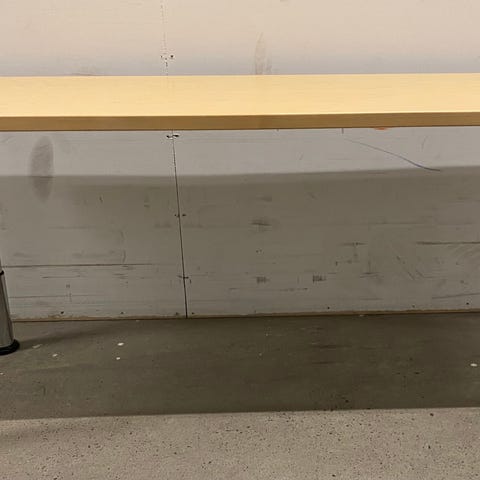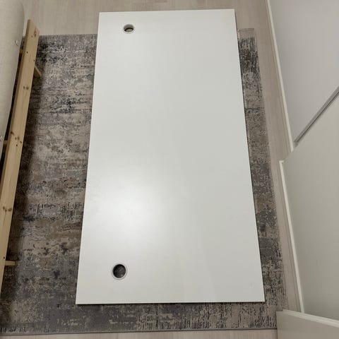 Pöytälevyn vas puolen syvyys on 68cm, oikean puolen 80cm, pöytälevyn puukehän korkeus 5cm, puukehän leveys 6cm. Pöytälevy on siis suunniteltu epäsymmetriseksi. Valkoinen pöytälevy erittäin hyväkuntoinen, toki siitä naarmuja löytyy. Kehän pystypinnassa paikoin naarmua. Toiminut lämminvarastotyöpöytänä, nyt tyhjennän varaston. Nouto Tampereen Tammelasta.