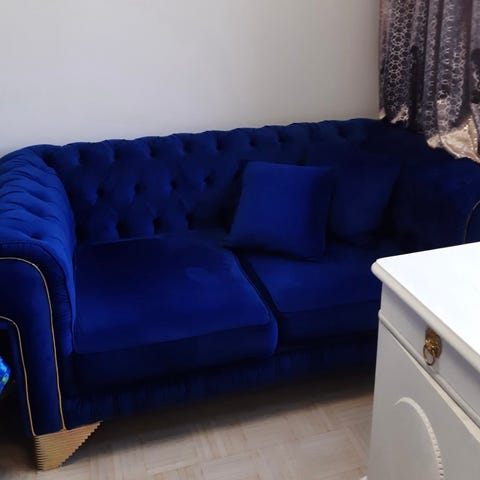 Sininen sohva,hyvä istua. Melkein uusi. Hinta 450 euroa.