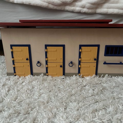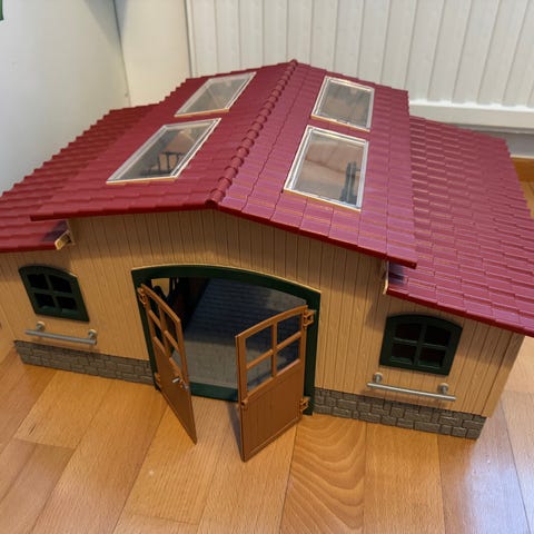 Puinen vankka Schleich-talli. Tallin lattiassa hieman jo leikin tuomaa kulumaa. Karsinoiden ulko-ovien saranat väistämättä jo paikoin löysän oloiset, mutta toiminut hyvin leikissä näinkin. Katon saa irti joko osittain tai kokonaan.