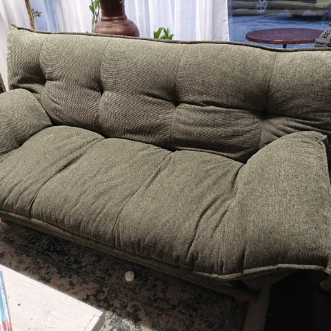 Maskusta ostettu laadukas Lintsi- sohva, jossa höyhentä pehmusteissa. Todella hyvälaatuinen ja tyynyt pysyy hyvin ryhdissään, kun välillä pöyhii niitä. Tyynyjen kankaat irroitettavia ja pestäviä. Siistissä kunnossa, pesu jää ostajalle muuton vuoksi. Eläimiä ei ole ollut taloudessa.
