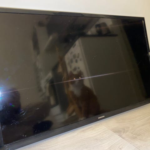 Tv toimii, on ollut meillä käytössä Chromecastin avuin, sopii myös esim pleikka tms käyttöön. Näytössä valkoinen naarmu, ei ole vaikuttanut toimivuuteen tai näyttöön sen enempää kuin kuvassa näkyy. Telkkariin kiinnitetty taso päälle johon voi asettaa esim kaukosäätimen tms.