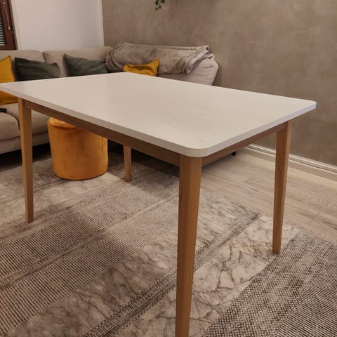 Haikein mielin myyntiin hieman yli vuosi sitten Jyskistä ostettu Ø120 ruokapöytä. Pöytälevy on tammijäljitelmäviilua, ja mustat teräsjalat viimeistelee modernin, ja silti niin ajattoman ilmeen.