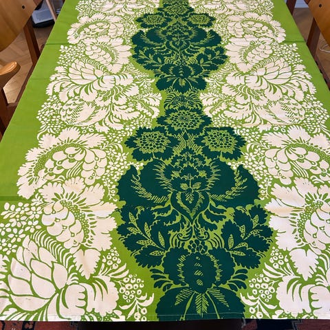 Lähes käyttämättä jäänyt pöytäliina pitkälle pöydälle. Ei kulumaa tai tahroja. Vain päädyt huoliteltu. Väri beige-ruskea-valkoinen.