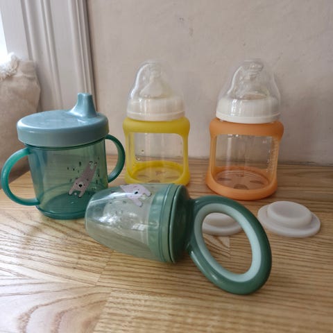 Vauvalle ruokailuun Ezpz Tiny Bowl, Nuk Magic Cup 230ml taikamuki (käytetty vain pari kertaa), Nuk easy learning Snack box, Pilvi ruokailuessu (takana tarra pitää vielä, mutta on mennyt koppuraiseksi), smoothiepussin korkkeja, Orthex ruokalappu ja Mam lautanen+kulho.