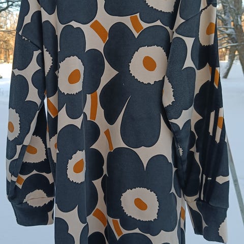 Adidas x Marimekko college mekko Unikko kuosilla. Väri sininen-musta. Koko M.Ehjä ja siisti.Mekon sisäpinta käytön myötä nyppyyntynyt, kuten usein college vaatteissa.Valkoiset raidat eivät ole lumivalkoiset, josko kuvasta näkyy mitä tarkoitan. Kunto huomioitu hinnassa. Taloudessani ei ole eläimiä eikä savua.