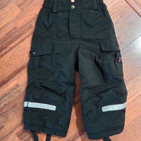 Hyväkuntoinen toppatakki ja mustat toppahousut molemmat kokoa 98. Housujen toisessa polvessa viirut, jotka eivät lähteneet pesussa, kangas on ehjä.