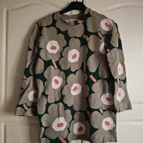Adidas x Marimekko college mekko Unikko kuosilla. Koko S. Kainalo-kainalo mitta n. 55 cm.Ehjä ja siisti.Mekon sisäpinta käytön myötä nyppyyntynyt, kuten usein college vaatteissa.Mekon väri hieman haalistunut pesussa, mutta se ei käyttöä haittaa. Kunto huomioitu hinnassa. Taloudessani ei ole eläimiä eikä savua.