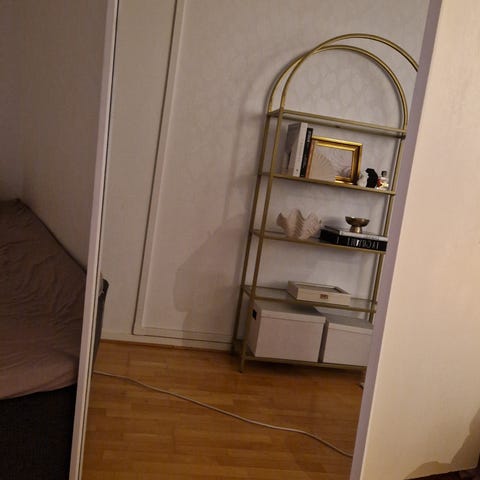 Omalla tuellaan seisova kokovartalopeili. Ollut joskus valkoisella koristekehikolla, mutta kehikko maalattu mustaksi.