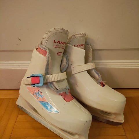 Lasten säädettävät luistimet, sisämitta n. 14-17cm. Suhteellisen terävät.