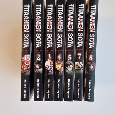 Myydään kuvan mukaiset suomenkieliset Titaanien Sota (Attack on Titan) Lost Girls mangat vol. 1-2 eli koko sarja. Molemmissa pokkareissa ensimmäinen sivu on värisivu. Luettu kertaalleen.