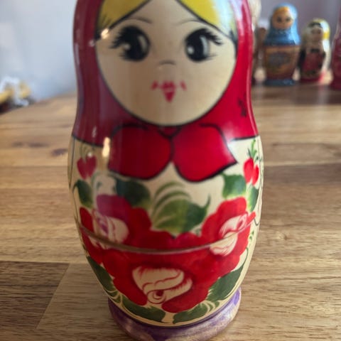 Matryoshka-nuket ovat puusta valmistettuja ja käsinmaalattuja. Setti sisältää useita nukkeja, jotka on koristeltu kukkakuvioilla ja perinteisillä kasvoilla. Yksi nukke on vahingoittunut, ja sen maalipinta on osittain kulunut.