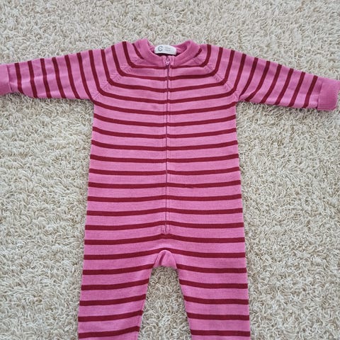 Cubuksen punapinkkiraidallinen merinovillapuku. Toisesta olasta reikä parsittu (kuva 5) ja yksi langannousu näkyy tikkauksessa vetskarin vieressä (kuva 2), muutoin siisti ja ehjä. 100% merinovillaa. Lapsi kasvoi puvusta ulos ja tulee suoraan käytöstä.