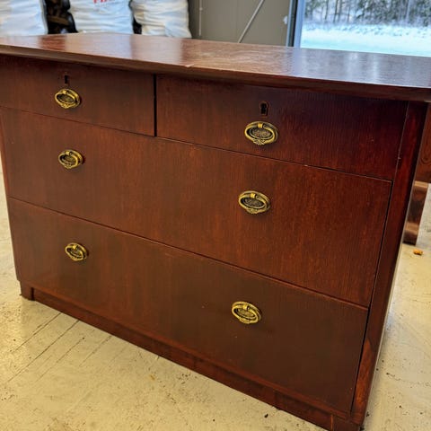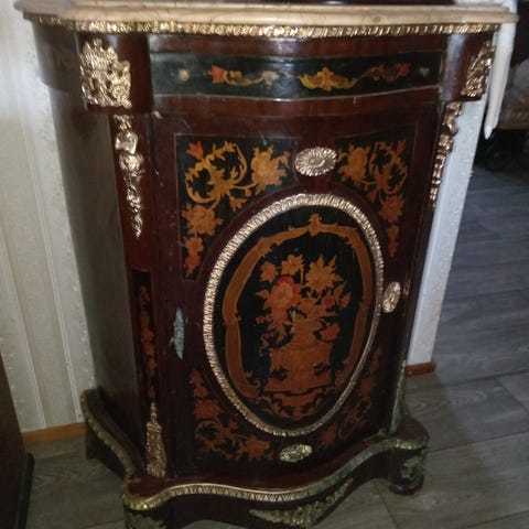 Pieni puinen uniikki lipasto, jossa on kaksi ovea ja kolme laatikkoa. Lipastossa on koristeelliset jalat ja klassinen muotoilu K 38, L 29, S 17. Sopii säilytykseen ja sisustukseen.