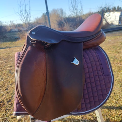Laadukas, uudehko (runkotakuuta jäljellä 06/2031 saakka), säädettävä estesatula lyhyeen selkään 16 tuumaa. Leveys tällä hetkellä MW (sininen kaari). Hevarin kaarilla saa säädettyä leveyttä helposti. Hyvä rangan tila, takaa nousevaan selkään. Kunnolliset polvituet.