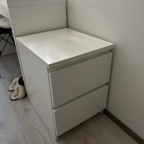 Lisäksi toisen yöpöydän laatikossa läikkä, kun siihen on kaatunut vettä, mutta ei näy ulospäin.