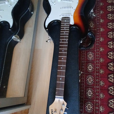 Lähes käyttämätön stratocaster tyyppinen sähkökitara.