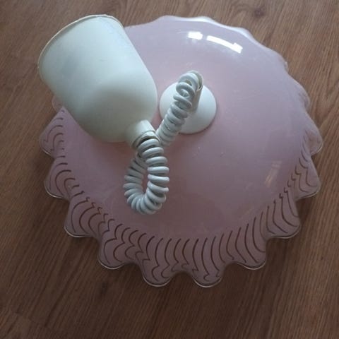 Annetaan pieni riippuvalaisin lasikuvulla (lasikuvun korkeus 8,5cm). Lampun kanta E14. Valaisimessa ei erikseen valokytkintä, johdon pituus 105cm.