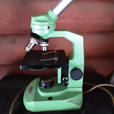 Mikroskooppi puulaatikossa. Valo ei pala. Mukaan käyttöohjeet ja muutama lasi.
