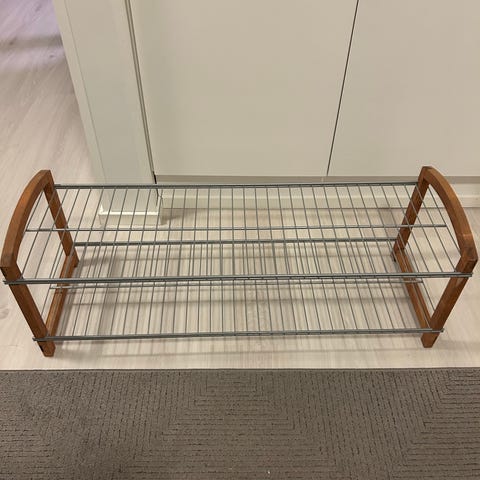 Hyväkuntoinen vuosi sitten ostettu kenkäteline. Ostettiin muistaakseni Jyskistä. Moderni ja musta. Liian leveä uuteen kotiin.