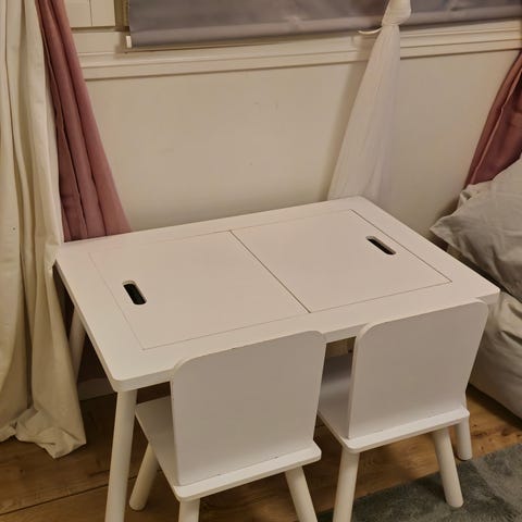 Myydään lasten pyöreä valkoinen pöytä ja siihen sopivat kaksi vaaleanpunaista jakkaraa. Erittäin tukevia, eivätkä jakkarat kaadu pienen alta. Käytössä ollut pitkään, joten elämää nähnyt. Silti yleisilmeeltä erittäin siisti. Pöydän leveys 80cm.
