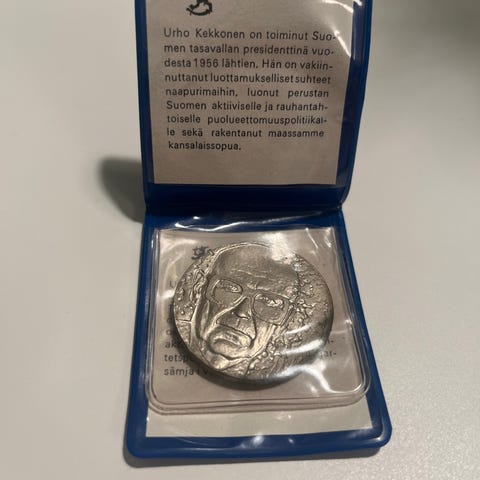 Kekkosen 10 mk juhlaraha joka painettiin vuonna 1975 Urho Kekkosen 75-vuotisjuhlan kunniaksi. Raha on tummunut, muutoin hyväkuntoinen, säilytetty aina muovitaskussaan. Ei ole edes yritetty kiillottaa. Postitus ok, en käytä ToriDiiliä. Myynnissä myös EMX Helsinki 1971 juhlaraha ja olympia 500 markkaa 1952.