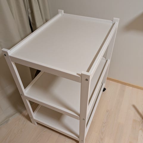 Ikeasta hankittu vauvan hoitopöytä. Hoitopöydässä on toisella sivulla kankainen taskukori, josa kätevä säilyttää pientä tavaraa vauvan hoitoon. Pöydän väri valkoinen. Toisessa päässä rullat, joiden avulla pöydän siirtely on helppoa.