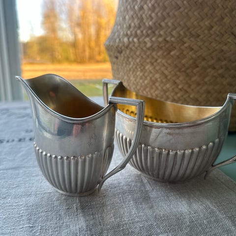 Hyvässä kunnossa olevat kotimaiset Chippendale sokerikko ja kermakko. Molemmissa kotimaisen hopean leimasarjat, valmistaja Kuopion kultaseppä Oy ja hopeapitoisuus 830/1000. Paino yhteensä keittiövaa'alla mitattuna 186 grammaa. Ei kaiverruksia, joten voi antaa vaikka lahjaksi. Täyttä hopeaa, ei lisäpainoa jaloissa tms.