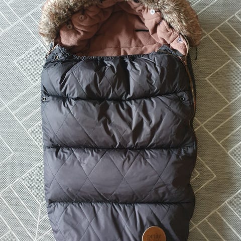 Petite Cherie toppapussi rattaisiin, musta väri, kultainen huppunsa ja karvareunus (napeilla kiinni, saa myös pois). Saa kiinni rattaisiin, valjaisiin. Hyvä kunto, pieniä käytössä tullutta kulumaa/nukkaa, mutta täysin ehjä.