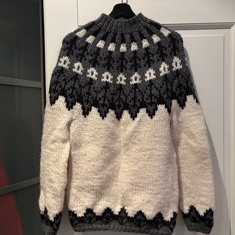Käsin kudottu neule. Muistaakseni Nalle- langasta, kuitenkin hyvä lanka.