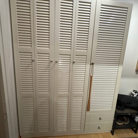 Kaksiosainen vaatekaappi, jossa vaaleanruskea ja valkoinen väri. Kaapissa on hyllyjä ja vaatetankoja säilytystilaa varten. Sopii hyvin lasten vaattteiden säilyttämiseen. Nouto Espoo, Kalajärvi.