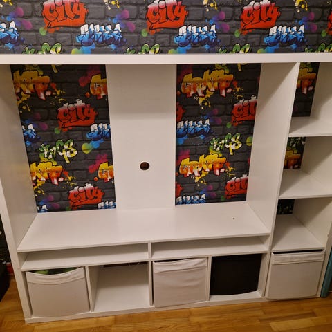 Ikean Kallax hylly johon edellinen omistaja laittanut ovet. Ne eivät enää ole pysyneet kunnolla kiinni eli vaatii joko pientä korjausta tai ovien poiston. Muuten hyllyssä vain pieniä käytön jälkiä.
