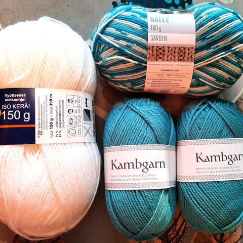 100 g:n kerät: 1 kerä yksiväristä 7 veljestä -lankaa, 1 kerä House kuviolankaa Luonto ja 2 kerää kirjavaa Socki-lankaa. Toisesta puuttuu vyöte. 70-80 % villaa + polyamidia.