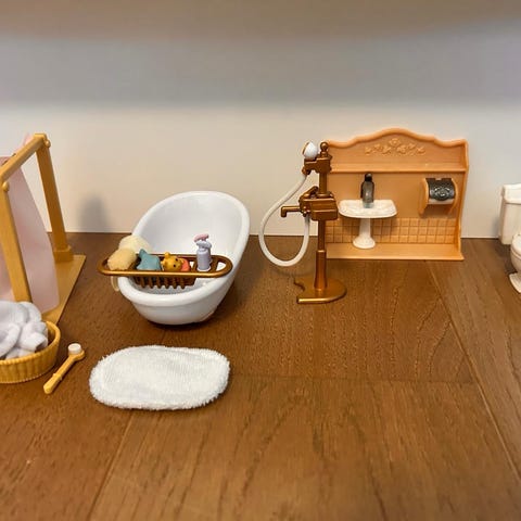 Myydään Sylvanian Families Kylpyammesetti kuvissa näkyvillä tavaroilla. Kylpyammeen jaloissa on hieman kulumaa, mutta muuten kaikki on hyvässä kunnossa.