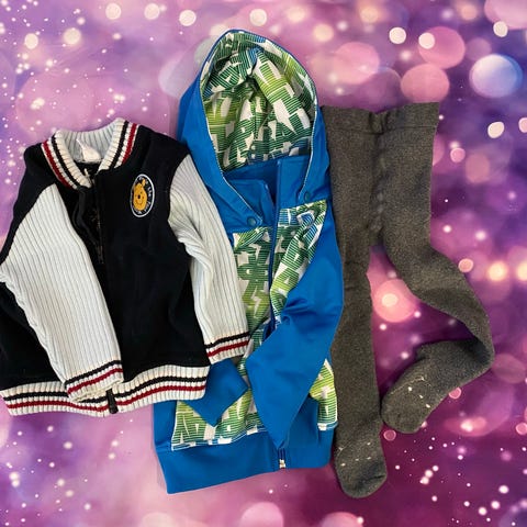 3 housut, 1 sukkahousut, 1 mekko, sukkia, villasukat ja peukuttomat tumput esim päiväunikäyttöön.
