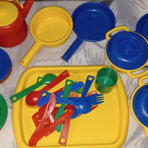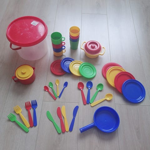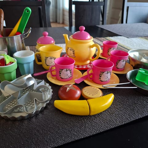 Pienet keraamiset leikkiastiat. Lautaset, kupit, kannuja, sokerikot.
