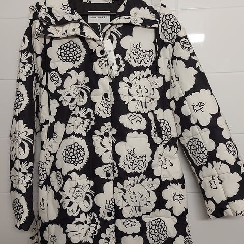 Vähän käytetty Merimekon talvitakki. Kankaan Veto suunnittelija Maija Isola. Alkuperäinen vyö kadonnut. Tilalla olen käyttänyt tuota mustaa vyötä. Kooksi mainittu L. Mitat mainittu kuvassa. Takki pesty hajusteettomalla Ecover pesuaineella.