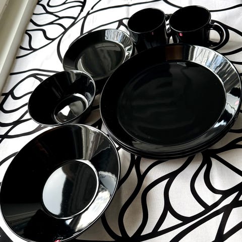 Tummansinisiä Teema-kuppeja ja lautasia
