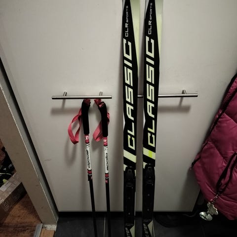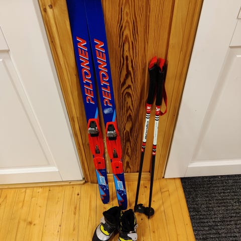 Sukset kerran hiihdetty, kunto ei uudelle häpeä. Monot 35 ja sauvat 115cm on vanhat mutta ehjät.