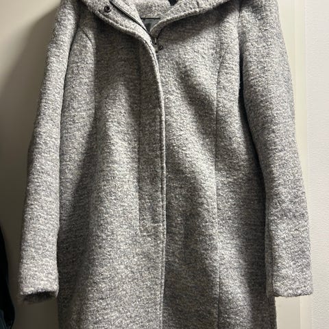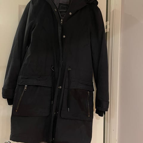 Vähän kevyempi vaaleanvihreä parkatalvitakki isolla hupulla, jossa irrotettava karva. Yksi karvan kiinnityslenkki irronnut.