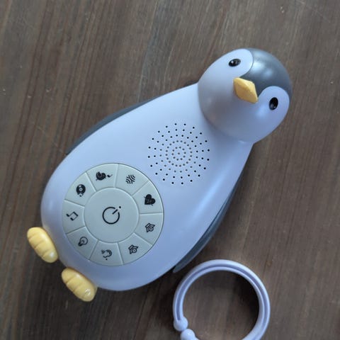”Tämä suloinen pingviini on sekä soittorasia, yölamppu sekä langaton Bluetooth-kaiutin. Voit itse valita, soittaako pingviini sydämenlyöntiä muistuttavia ääniä, valkoista kohinaa, kehtolauluja vai omia suosikkilaulujasi tai kertomuksia langattomasta kaiuttimesta. Pingviinin pää toimii yövalaisimena, jonka voit säätää kahdelle eri voimakkuudelle. Soittorasiassa on ajastin, joka sammuttaa valon ja äänet automaattisesti 20 minuutin jälkeen. Siinä on myös äänisensori, joka laittaa valon ja/tai äänet päälle, kun lapsi itkee.”