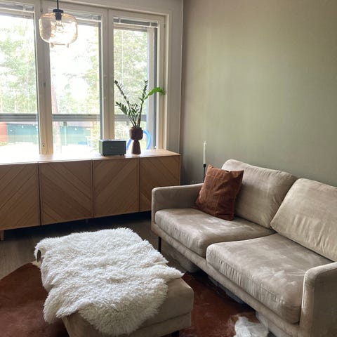 Uudenveroinen Askon Kata-sohva värissä puuteri. Kuvissa väri ei täysin pääse oikeuksiinsa, mutta viimeinen netistä otettu kuva antaa hyvän käsityksen.