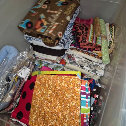Kaksi kangaspalaa, pidetty verhoina (eli reunat ommeltu. Koko 165 x 63, ommeltu jatketusta paloista. Vain nouto.