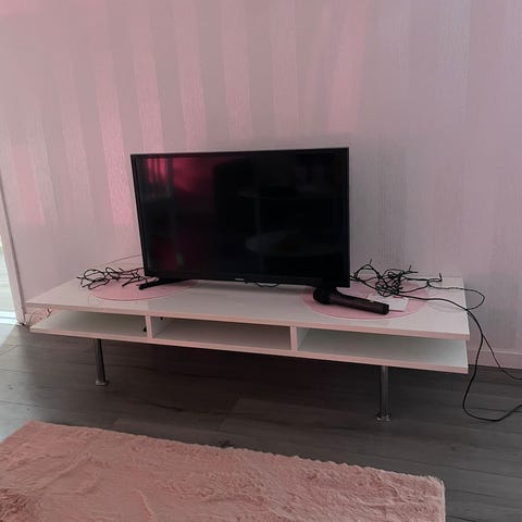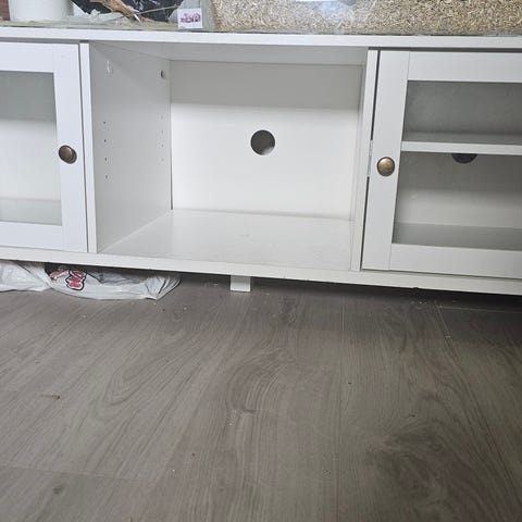 Ruskea tv taso / sivupöytä jossa yksi ovi ja avonaista hyllyä.