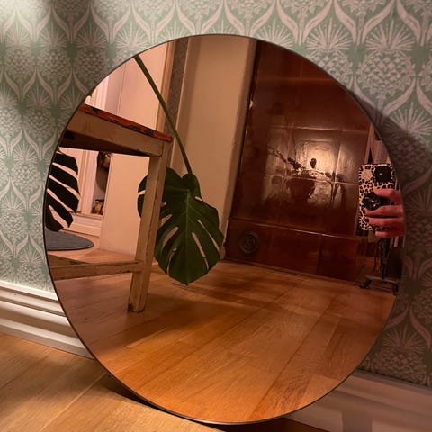 Halkaisijaltaan 100cm fasettohiottu peili. Ei kiinnikkeitä (tarra- tai reunakiinnikkeitä saatavissa ainakin rautakaupoissa tai esim Clas Ohlssonilla).