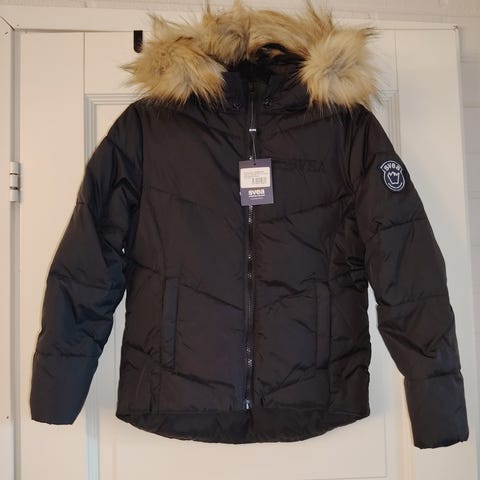 Svean untuvatakki. Pientä käytön jälkeä, mutta kaikkialta ehjä. Hupun tekoturkisreunus on kateissa.